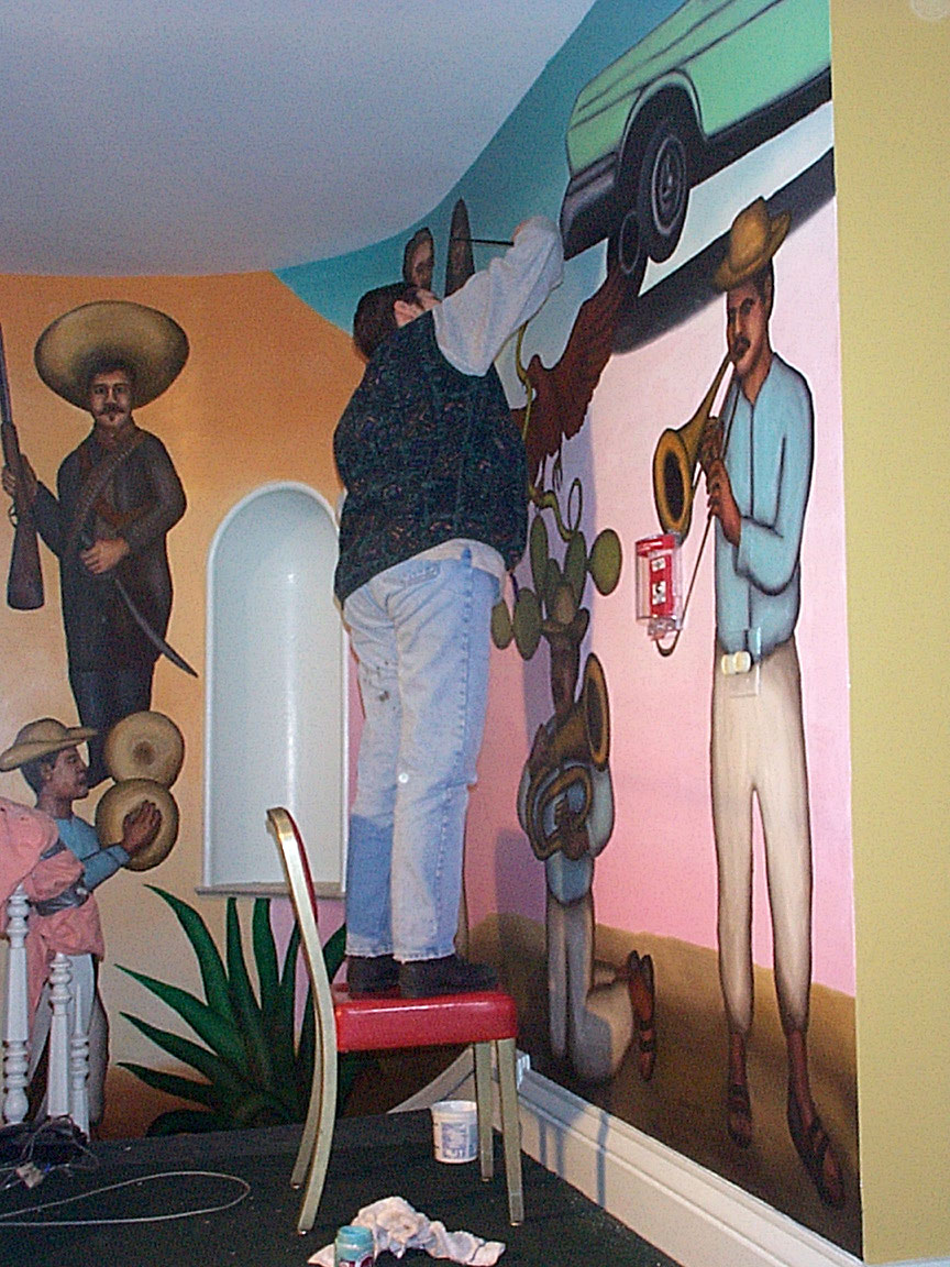 I met Casey Walpert at the Bug Jar where he was one of the original owners. He hired me to paint a mural in a building on Alexander Street, one that he was refurbishing and turning into a Mexican restaurant. I had been in the building years ago when it was called Chez Jean Pierre. By mid November 1999 Casey had the walls ready for a mural. He was planning on opening in a month. Karrie Laughton, who owns Lux on South Avenue, took some photos when the project was finished. And I documented the project with some photos as I went along.