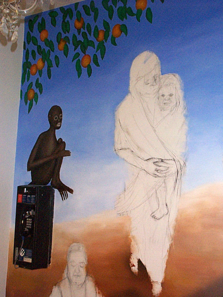 The space I was given to work with seemed awkward at first. It starts on the ground floor on your left as you step inside and it continues up the stairs around a round corner and on for another ten, twelve feet or so. At times the wall is 18 feet high and it’s over thirty feet long. There is no way you can see the whole wall at one time and you never get a chance to see much of it from any distance at all. But I love the space now and it has been a lot of fun painting here as all the work goes on around me. Casey went across the street today to buy some of the old booths out of the Rio Bamba which is changing hands. Robin has picked the colors for the walls – maybe twenty different colors. It’s going to be festive for sure. Casey was shooting for November and then December 15th but now he’s talking about a January 5, 2000 launch. I’m praying I won’t be up on this scaffold when people sit down for burritos.