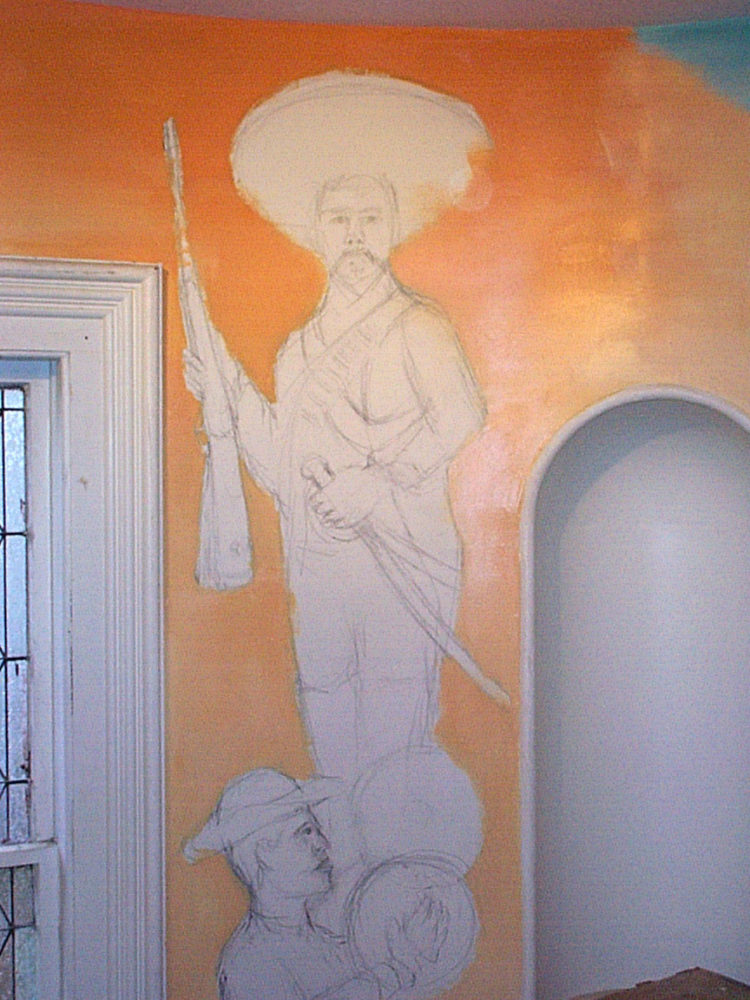 I painted Emiliano Zapata today. His boots got a little big and look more like waders than riding boots so I’ll have to fix that. Cortez, the Spanish conqueror, basically raped his way across Mexico. These two are are often shown together in Mexican folk art. They symbolize the mixing of the European and Indian culture that is Mexico today. This section, as you turn the corner on the stairs coming up to the dining area, is done at this point. Still undecided on the gang guys. I took an informal pool of the guys working here and they seem to be leaning toward keeping them in. I sort of am too at this point.
