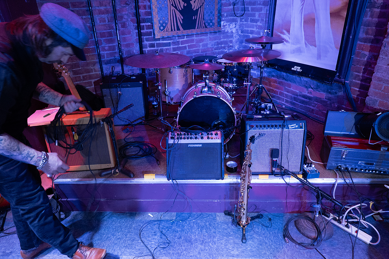 Minimalism always works. It maximizes the impact of the elements. I photographed Pete Monacelli’s drum set during Debbie Kendrick’s break when they played the Little Theatre Café. Yes, this is his whole set now. Pete was a master of the hi-hat. Coming up in the swing era he kept time with it. I use my hi-hat more like a noise-maker. Pete is short one leg these days so he has stripped down his uncle’s 1930’s set to just the snare and this cymbal mounted to the snare. He has great feel and still sounds like he’s playing a full set, especially when playing his beat up brushes, right hand sweeping while playing the butt end of the left hand brush on the rim. It is a wonder.