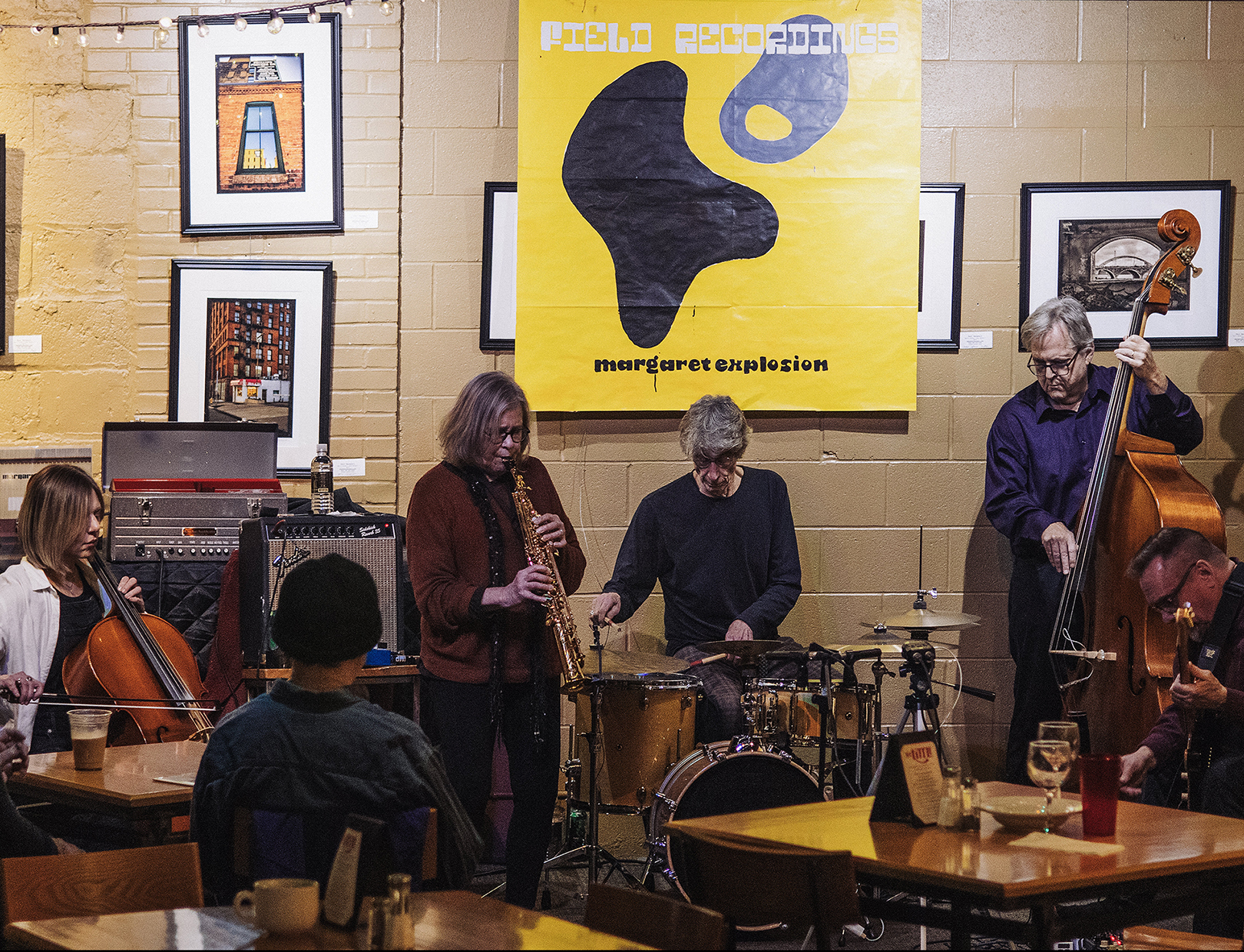 Poster for MargaretExplosion gig at Little Theatre Cafe on August 7, 2025. r. to l. Peggi Fournier – soprano sax, Melissa Davies – cello, Ken Frank – double bass, Paul Dodd – drums. Photo by Jason Wilder