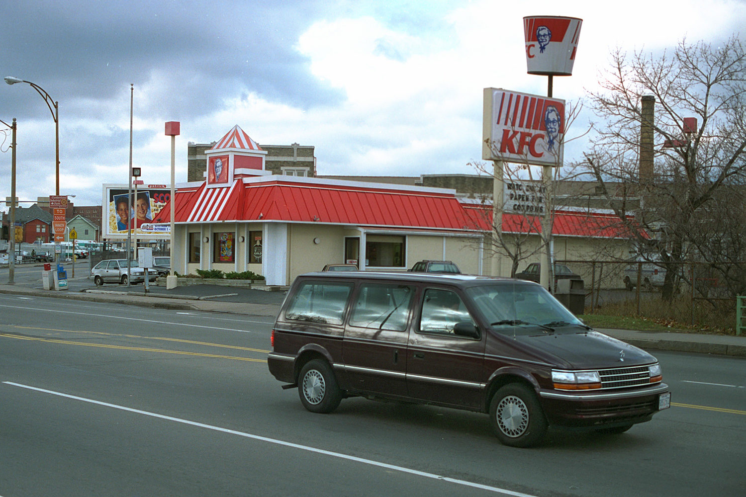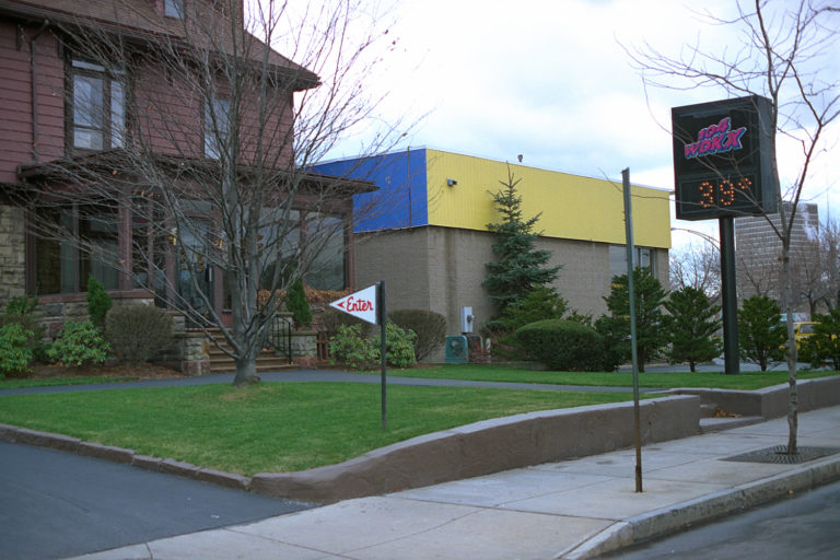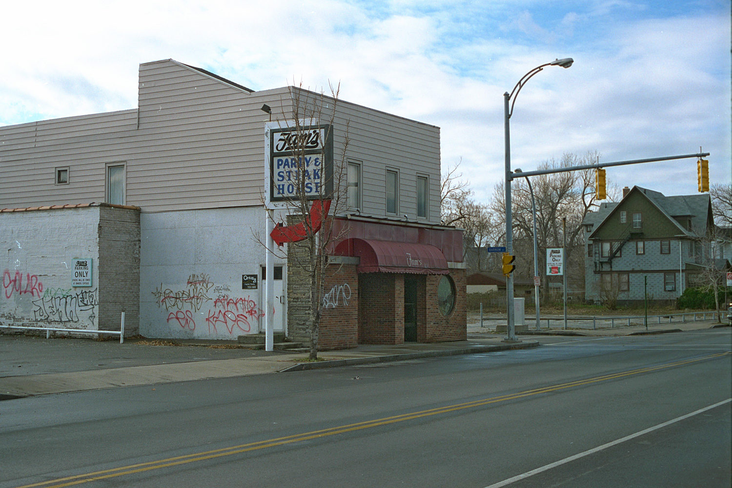Just over the tracks is Staub’s Cleaners. I was on a little league team in the Cobbs Hill league that was sponsored by Staub’s. I pictured the business as being a lot friendlier than this. My neighbor, Sparky, ate at the Penguin a lot. Last time we were in here there was bird flying around inside the restaurant. Hedges, the only funeral home on the route, would have to be where Jesus is laid in the tomb in Station Number 14. The 39 degrees display in front of WDKX is probably an average year round temperature in Rochester. KFC was just inside the old Inner Loop and almost downtown. I started picturing Christ as an African American.