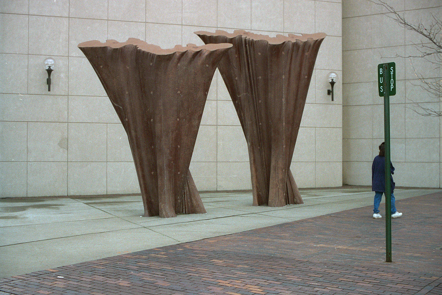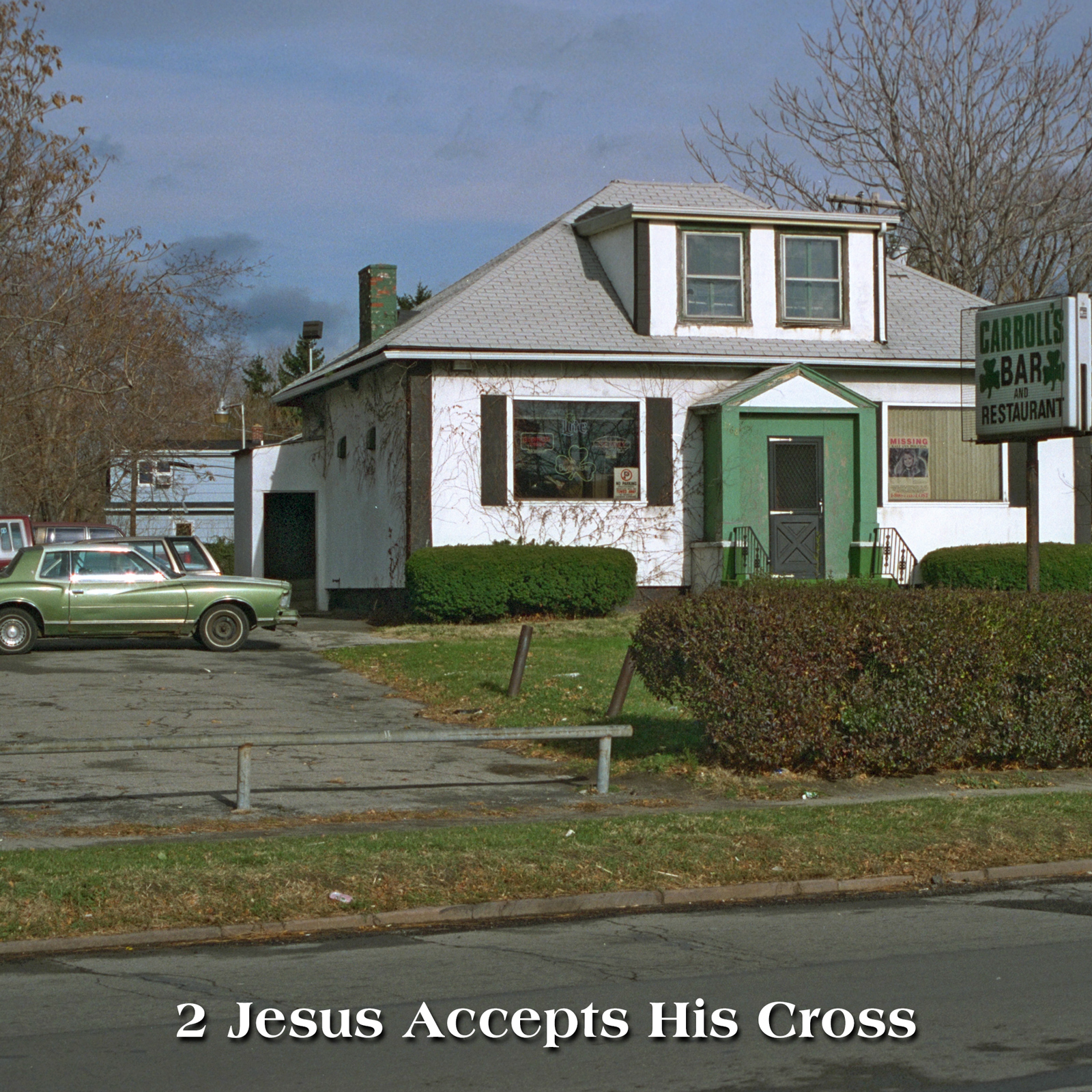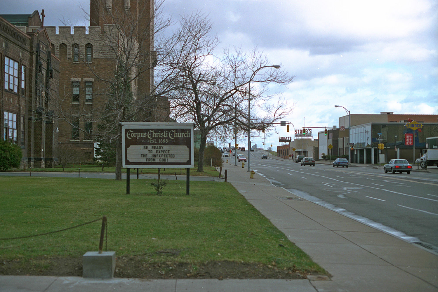 I decided on a contemporary route for the crucifixion. Jesus would be sentenced at East High near our home. He gets his cross across the street at Carroll’s or in McDonalds’ parking lot, works his way down Main Street and gets crucified at the Liberty Pole in downtown Rochester. I took this route to work almost daily and was baptized at Corpus Christi Church (Station #7). I also took some photos of the locations, one roll of slide film, and I chose settings for the fourteen Stations from those.