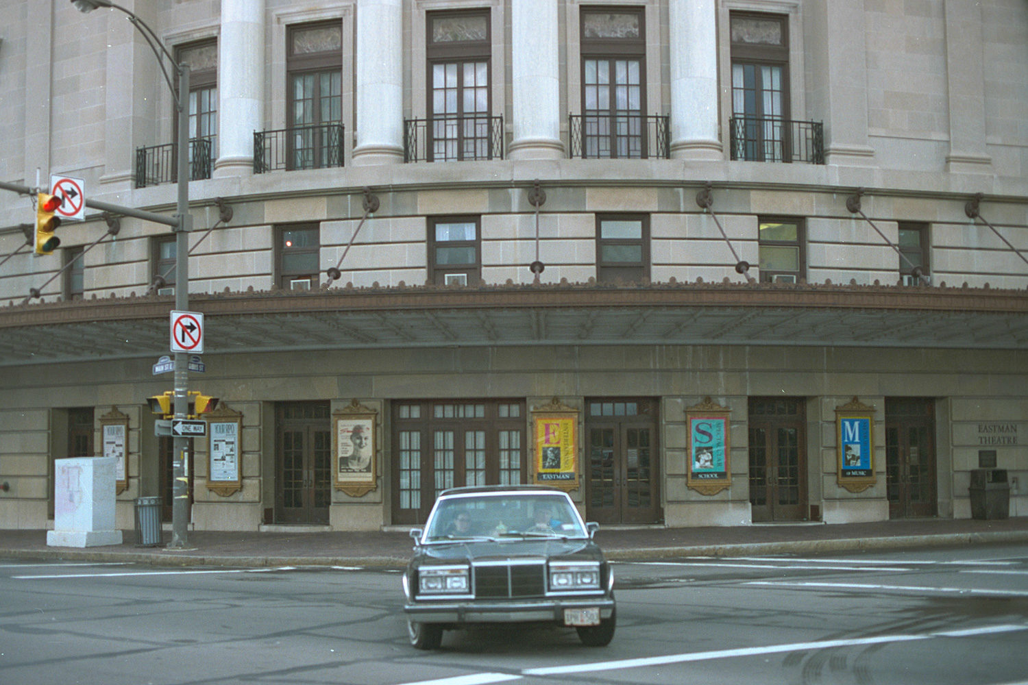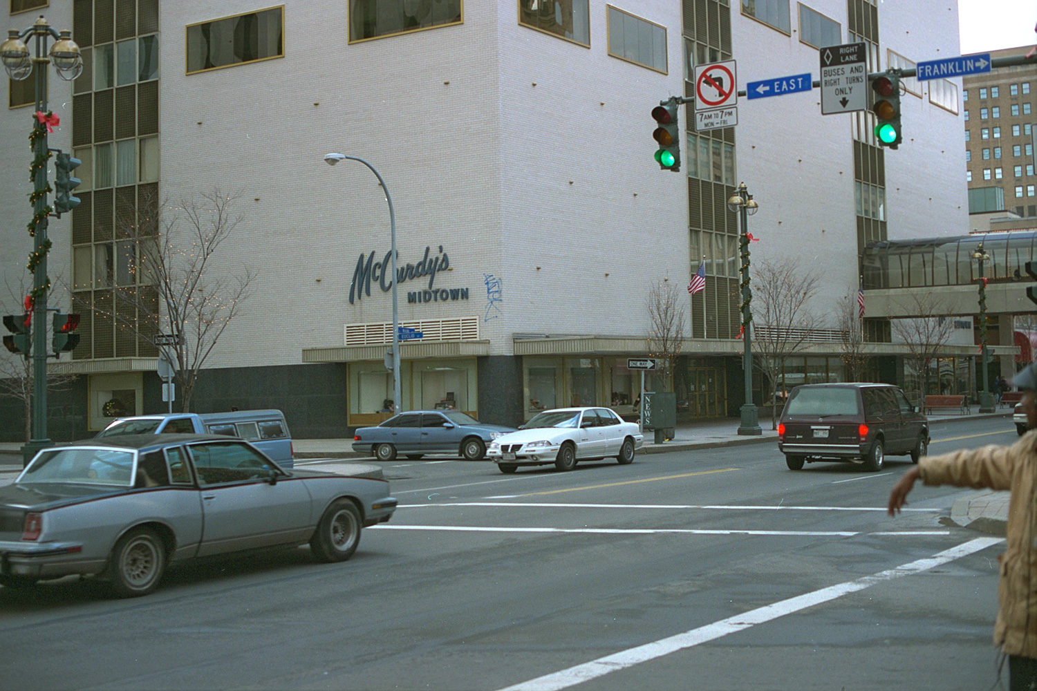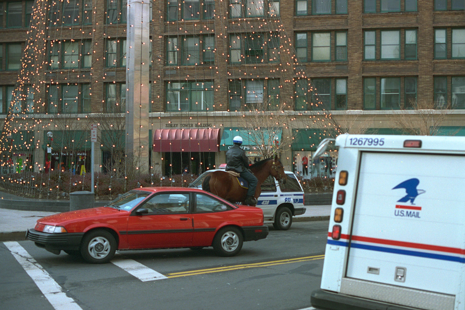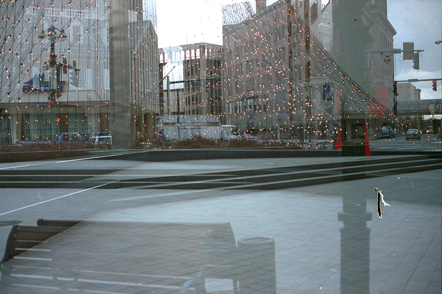 The parking lot in front of Snuffy’s is where a Rochester mobster was blown up about 25 years ago. I worked downtown at the time and I remember looking at the big pit in the pavement right behind where that red pick-up is. Christ gets crucified at the Liberty Pole. Christ dies on the cross while Midtown Plaza dies in the background. The Roman guard on the horse is ready for crowd control duties.I turned to get a good shot of the Liberty Pole and found I was out of film. I forced the last shot and ripped the film (see photo above) but got a nice double exposure for the dramatic thirteenth station.