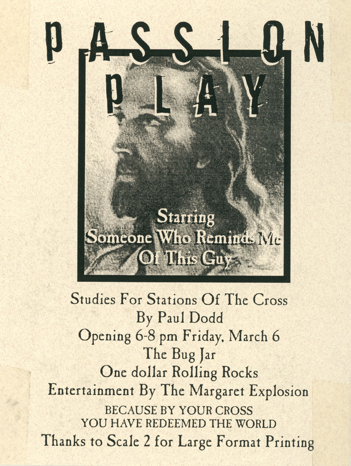In 1996, in the tradition of my patron saint, I started thinking about a re-telling of Christ’s crucifixtion, commonly depicted in most Catholic churches as the Stations of the Cross. I looked at Renaissance paintings of the crucifixtion and looked to popular sources for a modern-day Christ figure. I gathered classic depictions, my own drawings, holy cards, and source material from newspapers. I collected this all in a big sketchbook. Two Lenten seasons came and went while my sketchbook grew. Ted Kaczynski was a front page story on Good Friday, 1996 and then on Good Friday, 1997, the leader of the Heaven’s Gate cult was featured on the front pages.