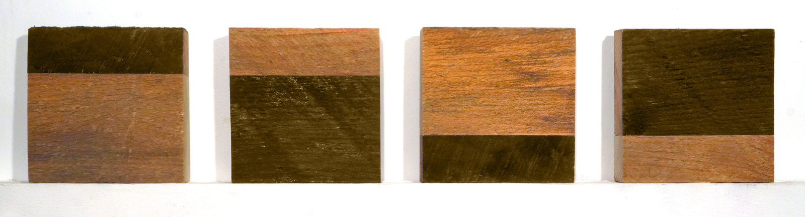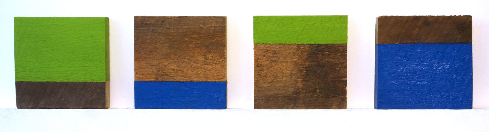 They are awkward to hang. I ask that be hung in a specific order and hope they don’t wind up being separated when the show is hung. The first year I painted the two boards a different color, three colors for the four pieces, all straight from the tube. The second year I toyed with leaving the wood unpainted altogether as the the two pieces were different tones but I chickened out. I let the natural wood show and only used two colors.