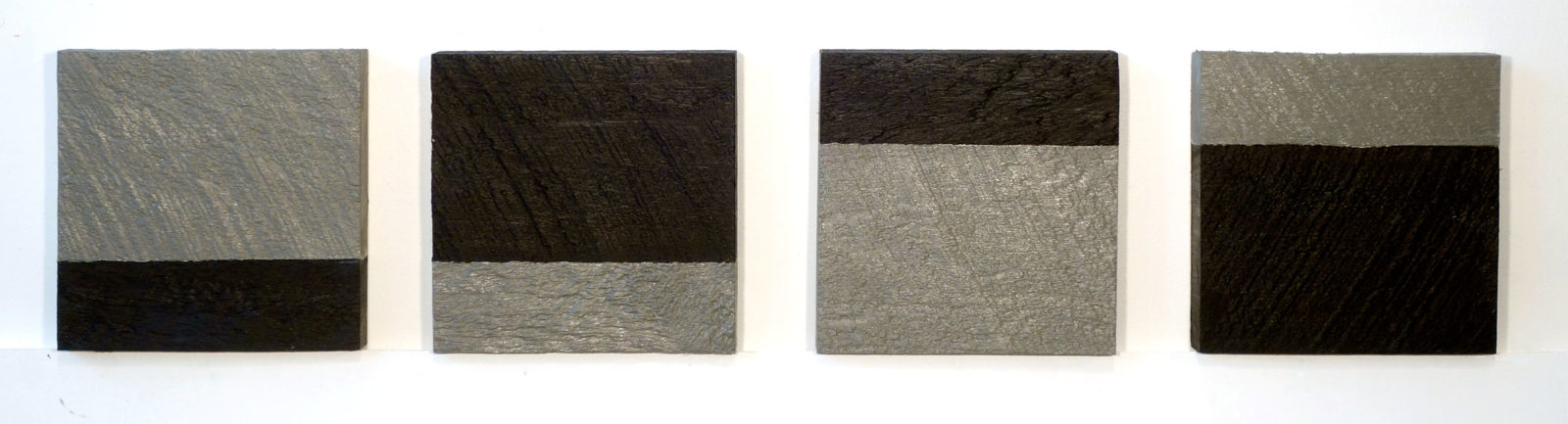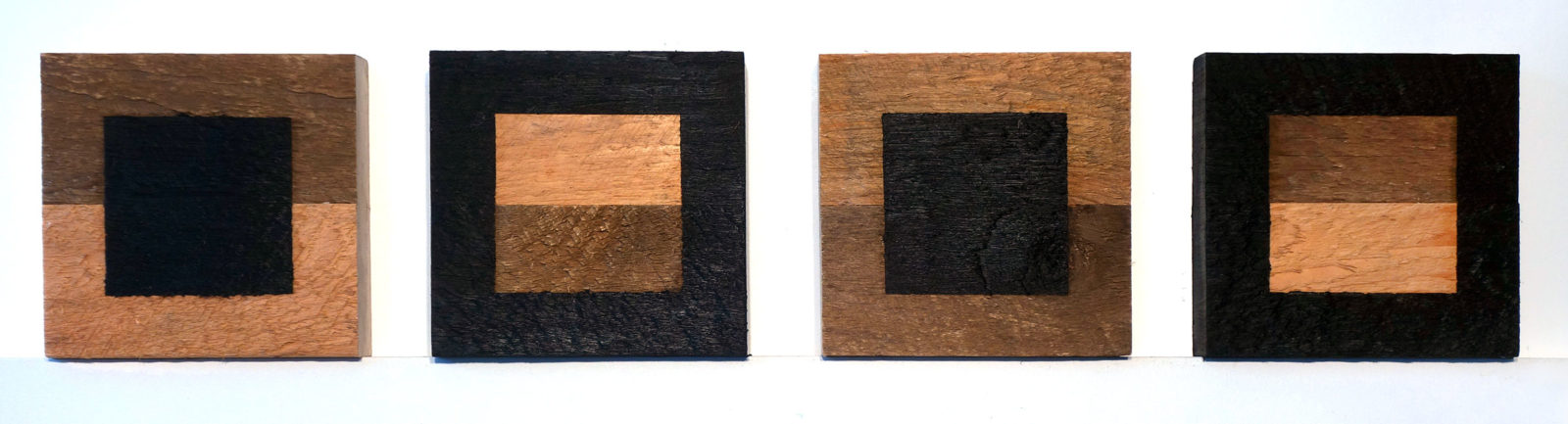 Year three I reduced the palette to one color. I ripped the boards in three inch widths this time and painted either a square within the square piece or the space surrounding the square. I played with black and white for the forth year but decided the white would not hold its own on a white wall so went to this silvery color. If they hadn’t sold each year I would have moved on. This year I pushed it and left the blocks au natural. After a few days I decided to strengthen the dark portion of each piece by coating it with a quick drying oil.