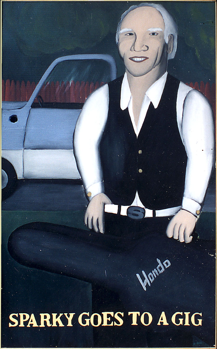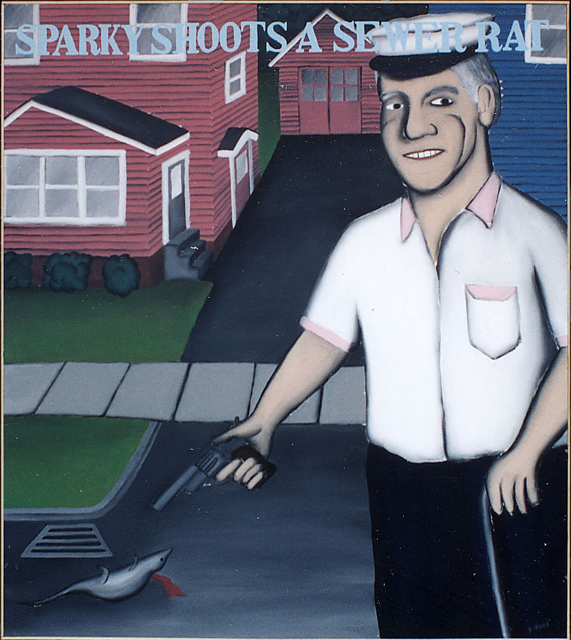 I did a group of paintings of Sparky in 1992 and they they were featured for a month in the window of Godiva’s on Monroe Avenue. John, the owner of the Oxford Pub across the street, bought them and they hung in that bar for years. He told me he was thinking about renaming the place “Sparky’s.” A friend told us she spotted three of the paintings at Murphy’s Law on Empire Boulevard, another bar that John owns.
