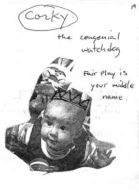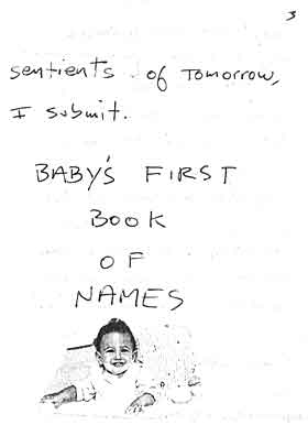 Or you could take this tack. I heard on the radio something about automakers having to install “back up” beepers by year whatever. How about the complete police package activated on ignition? Alternate flash hi beams, random sample sireen, red white blue cherry cap. And let’s have the air raid klaxon always wailing away. All firehouses blaring, because you never know. Turn on the radio: “Special Alert! Looking Glass Will Now Play Brandy! I Repeat-Looking Glass Will Now Play Brandy!” Then you look at one dog for every boy and one dog for every girl, one dog for every person on this world, strained at the ends of their chains, twix neck and hinds, howling defenses at an elusive paradise.