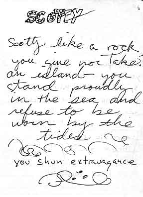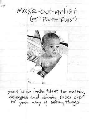 I would stay up all night doing the wackiest jobs I could on projects for my Humanities class because I had a crush on the teacher, Miss Crawford. It was a truly symbiotic relationship in that she’d give me “A’s” and notate in red with vague sexual innuendos. Then it would start all over again. I never mentioned it to anyone, but somehow people who I didn’t know knew. Teachers I’d never spoken to before or even had would ask me “Where’s Ginny today; Is her car okay?” Yeah right,Is Scamper under the porch again; how the fuck should I know, small fish me.” Then one day I was meeting her to go blow some dope on her lunch break and like this Chemistry teacher who was flunking me for doing absolutely zero work and who called me King Lear for some reason, came in and asked “Miss Crawford, may I see you for a moment in the broom closet…Alone?” She looked at me and said “I have to go listen to this thing on the radio with Mr. Sullivan okay?” They were in there for a while and I couldn’t resist. They were laying on the floor; she was cupped into him. He was grunting and she was heavily breathing my name. “Oh Pete, oh Pete, oh Pete, I’m busy.”