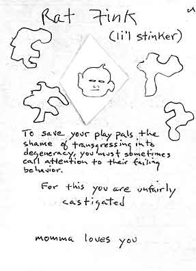 Funny little guy, cataract lenses (more on that later). Thing is; if he’d had his mouth full of Takee Outee Shrimp On A Stick or a bologna and mozzarella mock reuben on white, we might have thought he’d said “Ow, hit me. I long for hate, really!” And Sandye would have probably started kicking his butt for him.