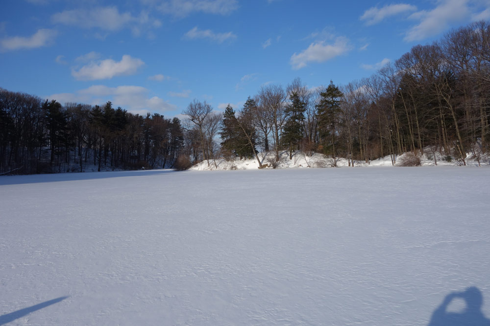 Lake Ontario is the only one of the Great Lakes with some open water and if the cold continues as expected it too will be frozen over in other week. The lake looks fantastic but don’t look too close. An RIT kid may have fallen off the ice covered Charlotte pier this week and disappeared. Peggi and I skied across Eastman Lake this afternoon, trusting that it was completely frozen over. I took this photo from the middle of the lake.