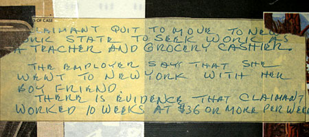 I found this note from that time period. It’s an unemployment claim that Peggi made while she was looking for work. When we left Bloomington she was working as a dental assistant. The first thing this dentist did was gas the kids to keep them quiet. Peggi and her coworkers hung around the office after it closed and sampled the gas themselves. The note says “Claimant quit to move to New York State with to seek work as teacher and grocery cashier. The employer says that she went to New York with her boyfriend. There is evidence that claimant worked for 10 weeks at $36 or more per week. I think she was rejected.