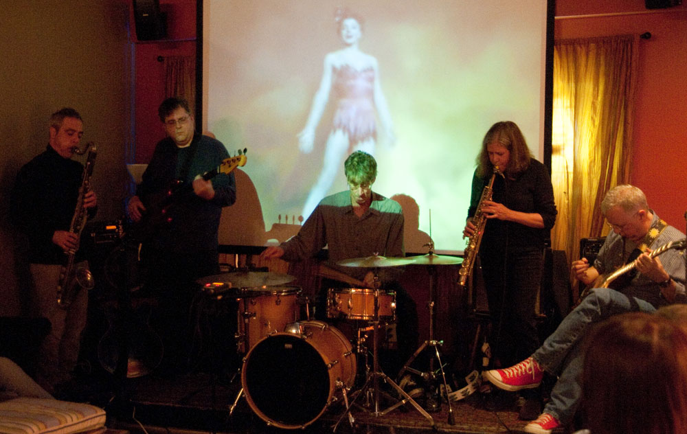 Margaret Explosion playing at Bug Jar Happy Hour in 1998. Jack Schaefer on guitar, Paul Dodd on drums. Pete LaBonne on bas guitar and Peggi Fournier on soprano sax.