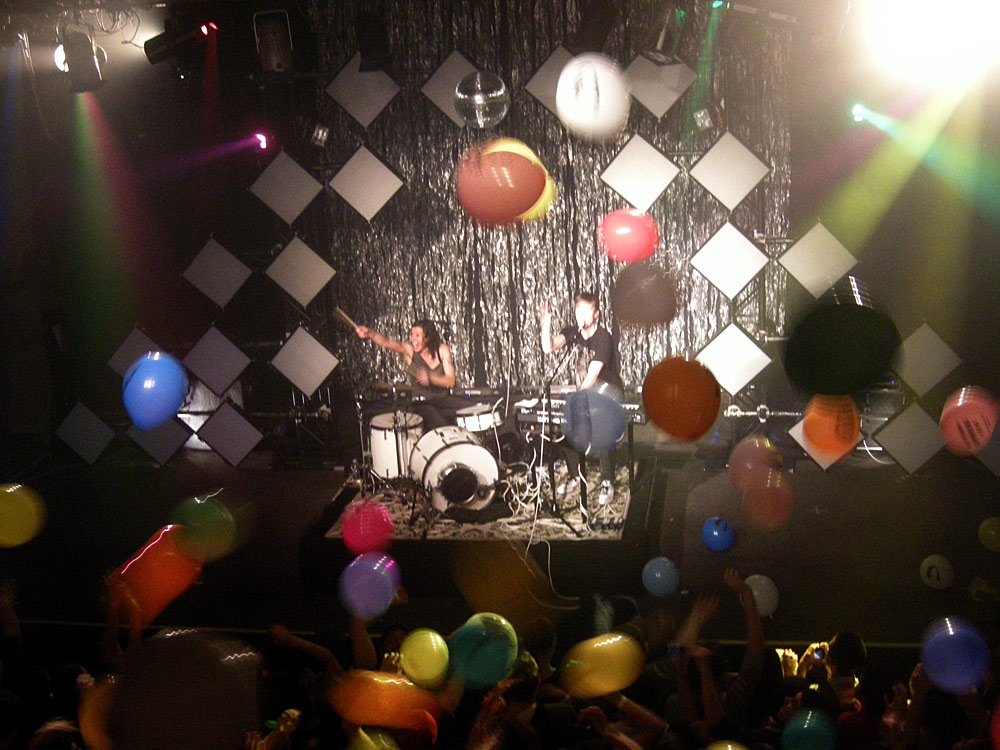 Kevin put us on the guest list and took us upstairs where we grabbed front row seats in the balcony right next to our friend Olga. Matt and Kim smile relentlessly and Kim’s smile is incredibly infectious. She’s a Joan Jett style tomboy with a swinging, stripped down drum kit, no rack tom or hi-hat and only one cymbal. She spent a good bit of the set standing on top of her kick drum. I couldn’t take my eyes off her. Maybe some of the girls watch Matt play his keyboards but I doubt it. No wonder her’s was only picture on the balloons thy released. Kim is a star but Matt did write one hell of an anthem.