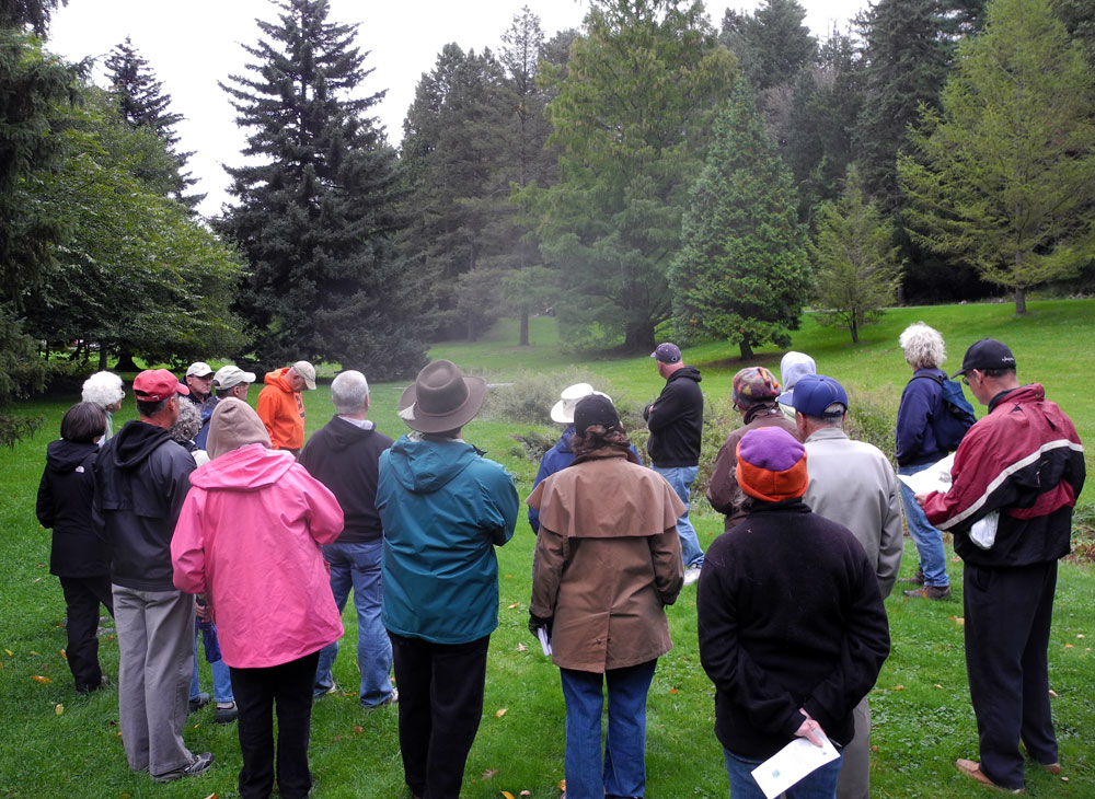 The misty white center portion of this photo, what I thought was a light leak, turns out to be dust on my lens. The lens cover on my Nikon P7000 is acting up again. Here it looks like an apparition as volunteers who help the county maintain the park hosted another of their weekly arboretum tours. The last tour of the year is next Sunday at 2pm and starts in the parking lot of the old zoo.